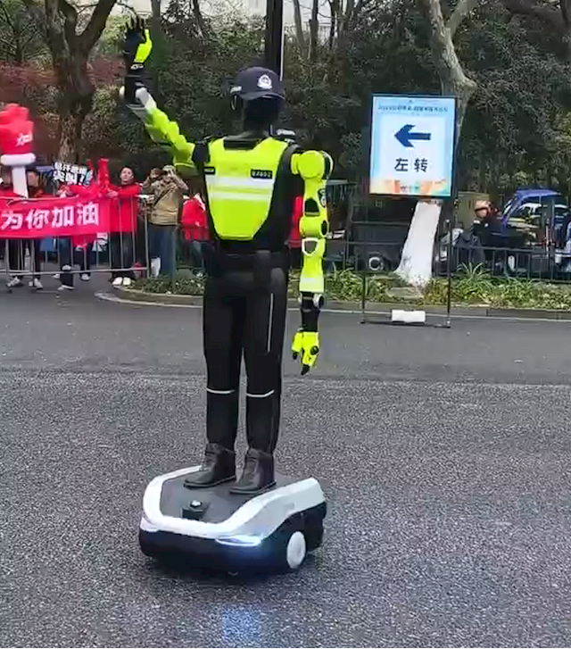 无独有偶,同日举办的无锡马拉松也投入双足人形警用机器人,承担交通疏导与赛道安保工作。