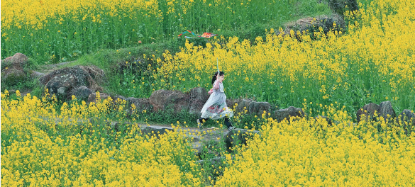 暖春已至,重庆云阳县黎明古村生机盎然。金灿灿的油菜花海、古朴的百年老屋,互相映衬成一幅独特的春日盛景。“来这里看花海的最好方式,莫过于乘坐这趟‘春日限定’观光小火车了!”近日,来黎明村度假的刘女士被这里的田园风光深深感染。她坐上小火车在花海中穿梭,打卡拥有百年历史的古建筑,体验非遗“亚亚戏”、川东竹琴,感受这里的人文气息与自然美景。