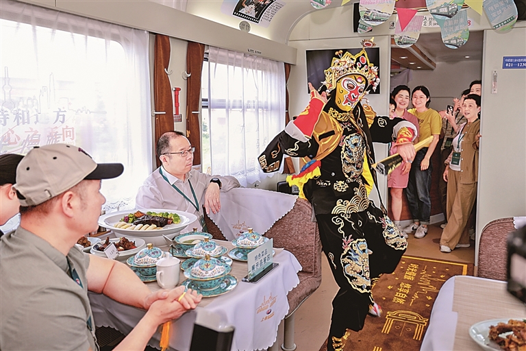 旅客在Y476/7次“长三角号”援疆银发旅游专列上观看变脸表演。新华社发